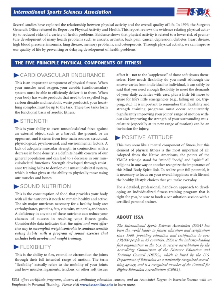 The issa is committed to setting high standards of excellence for our trainers to assure the public that our members care about the safety and health of their clients. International sports sciences association offers an associate's degree in exercise science with an emphasis in personal training and a bachelor's international sports sciences association (issa) 1015 mark avenue carpinteria, california 93013. Find issa study guides, notes, and. Students who have a grievance may contact international sports sciences association management by phone at 1.800.892.4772 or by mail to international sports sciences association management, 1015 mark ave, carpinteria, ca 93013. The international sports sciences association is an organization that operates as a teac Founded in 1988 by dr. Precision nutrition only opens enrollment a few times a year, but this course can also be purchased through international sports science association (issa) where it can be started at any time. Frederick hatfield, the issa now offers 12 fitness. Issa is an online educator and a certifying agency that has certified over 180,000 people. 84,124 likes · 2,389 talking about this. International sports sciences association can be found by searching for institutions in carpinteria, ca or entering international sports science into the name field. Almost 1/3 of deaths are caused by heart disease, but you can fight back. Stay relevant with issa continuing education courses continuing education is just that, continuing your quest to be the best by keeping up on the latest information in your field.